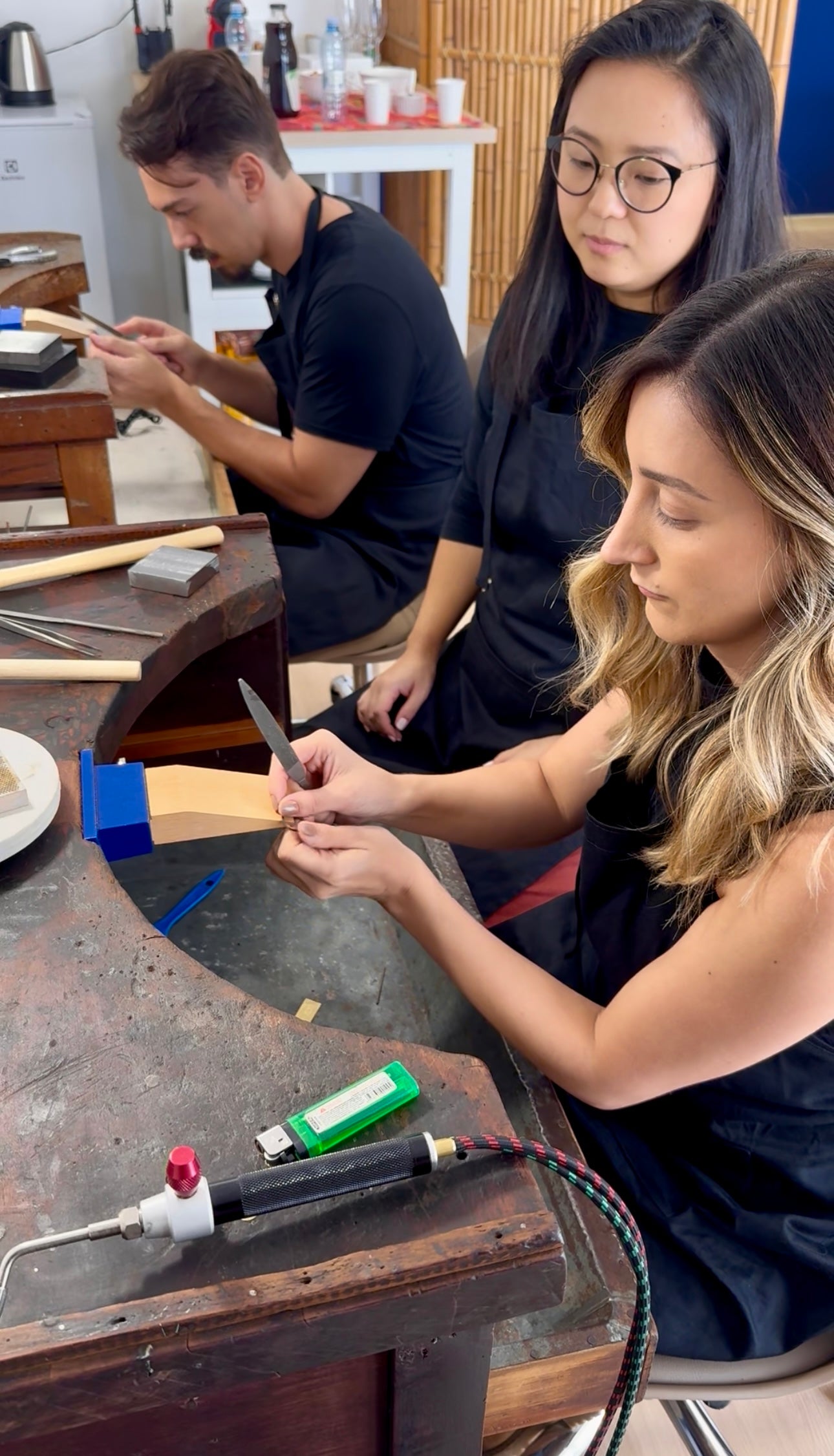Em uma vivência imersiva de aproximadamente 3 horas de duração, o casal vai construir suas alianças com suas próprias mãos: martelar, serrar, soldar, lixar e polir. Tudo sob a orientação da Paula Miyahara - que além de fundadora e ourives do ateliê, é professora de joalheria artesanal em um dos ateliê-escola mais tradicionais de São Paulo.