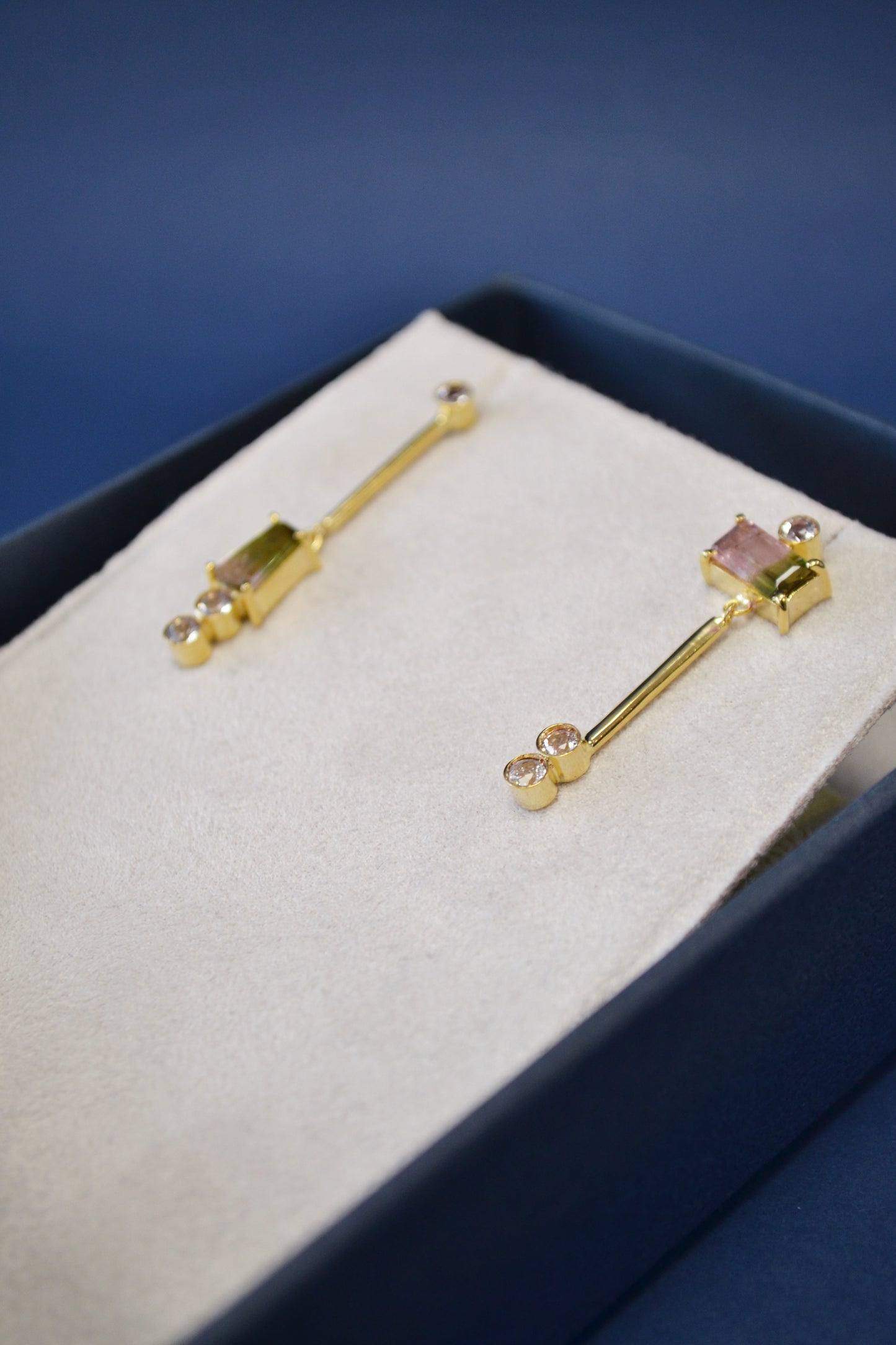 Este par de brincos tem como protagonistas lindos exemplares de turmalinas bicolores que, com seus tons vibrantes de rosa e verde, unem o poder do amor próprio e aceitação à cura emocional profunda. Topázios incolores adicionam brilho a esta joia delicada e assimétrica.