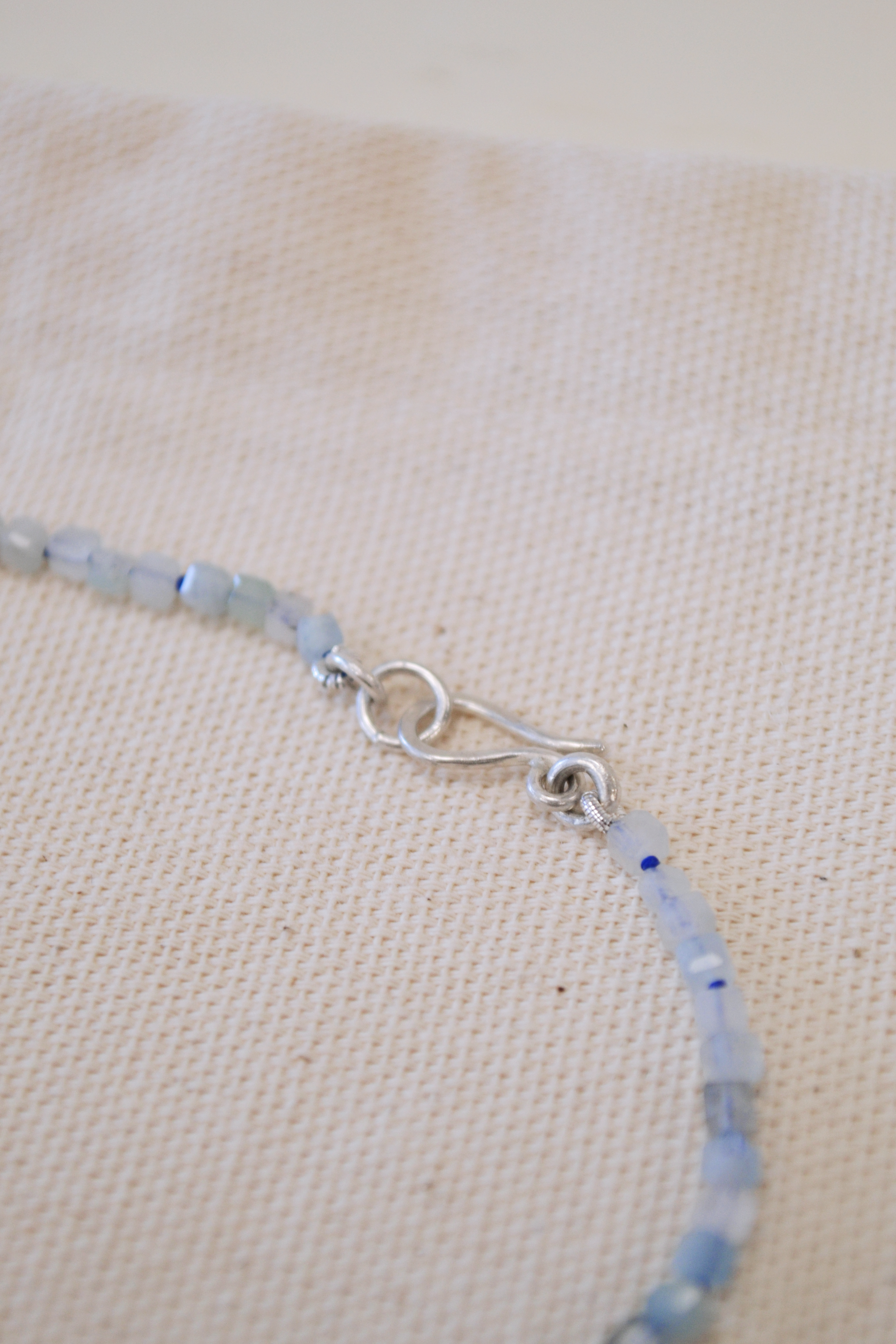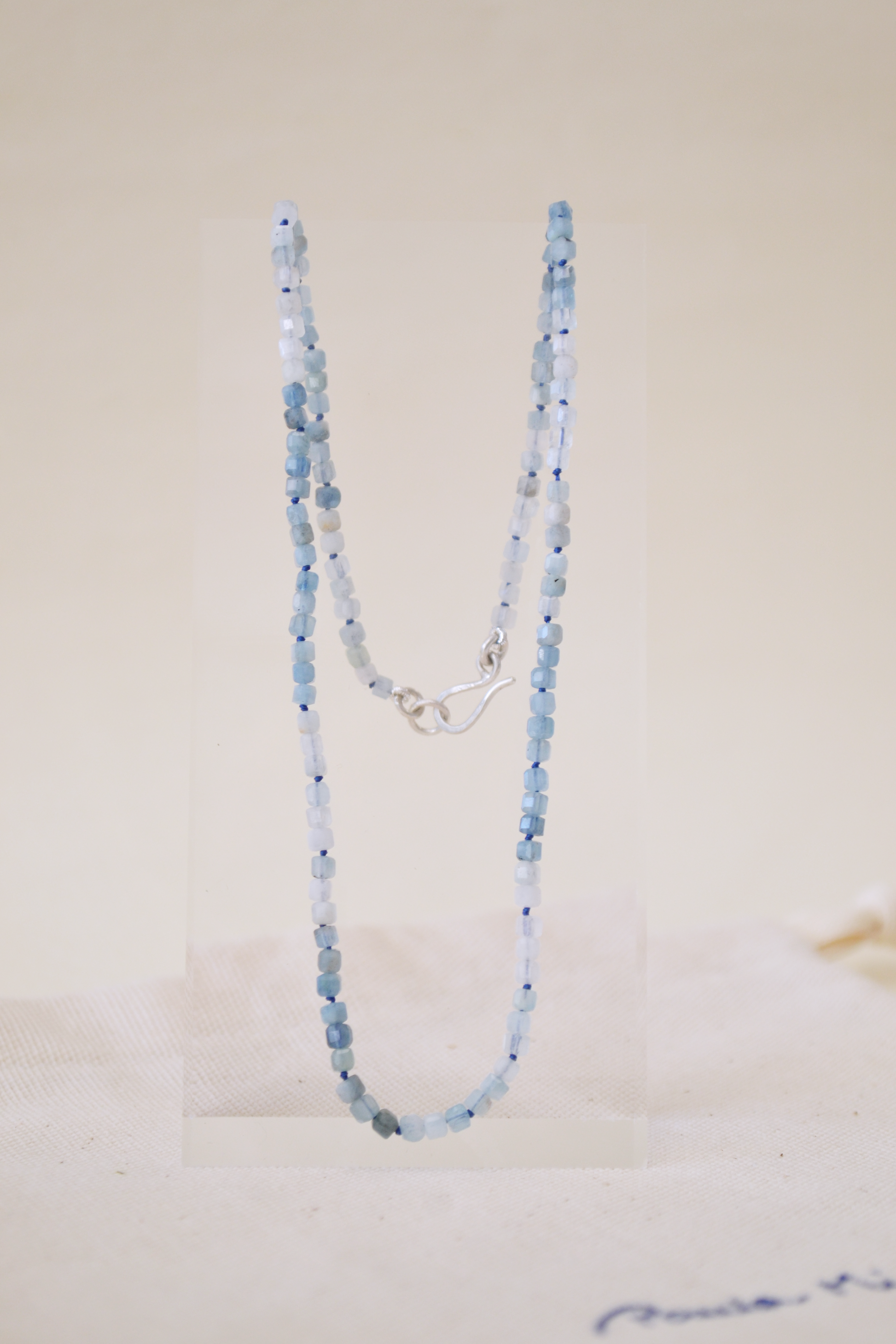 Este colar é composto por águas marinhas em delicados tons de azul, que juntas remetem à calma de um céu de primavera. Acredita-se que a água marinha carrega uma energia tranquilizante, nos convidando à serenidade e ao equilíbrio.